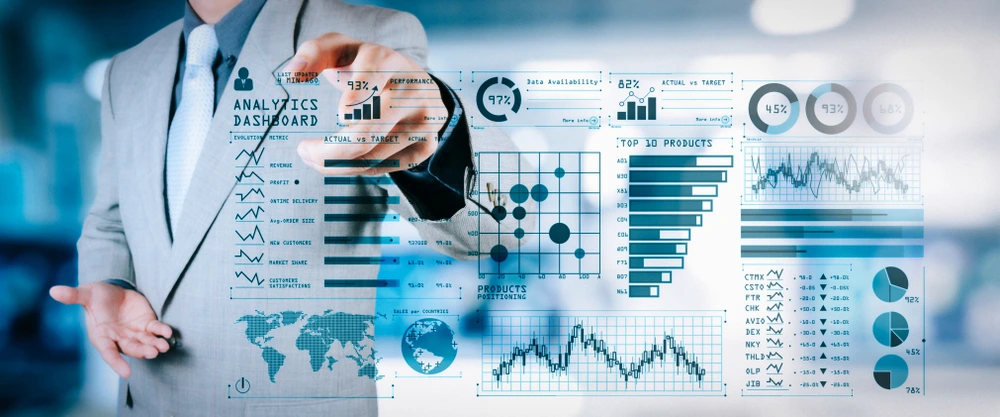 Interactive data dashboards, emphasizing analytics and visualization in business strategies, enhancing decision-making through insightful data representation.